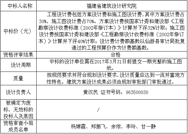 根據(jù)評(píng)審結(jié)果確定福建省建筑設(shè)計(jì)研究院為中標(biāo)人, 現(xiàn)在在仙游縣建工投資集團(tuán)有限公司公告欄和仙游縣建工投資集團(tuán)有限公司網(wǎng)站上公示。公示期自2017年 2月 4日至2017年 2 月 10日。投標(biāo)人對(duì)中標(biāo)結(jié)果有異議或認(rèn)為評(píng)標(biāo)活動(dòng)存在違法違規(guī)行為,可在公示期內(nèi)向有關(guān)部門投訴。